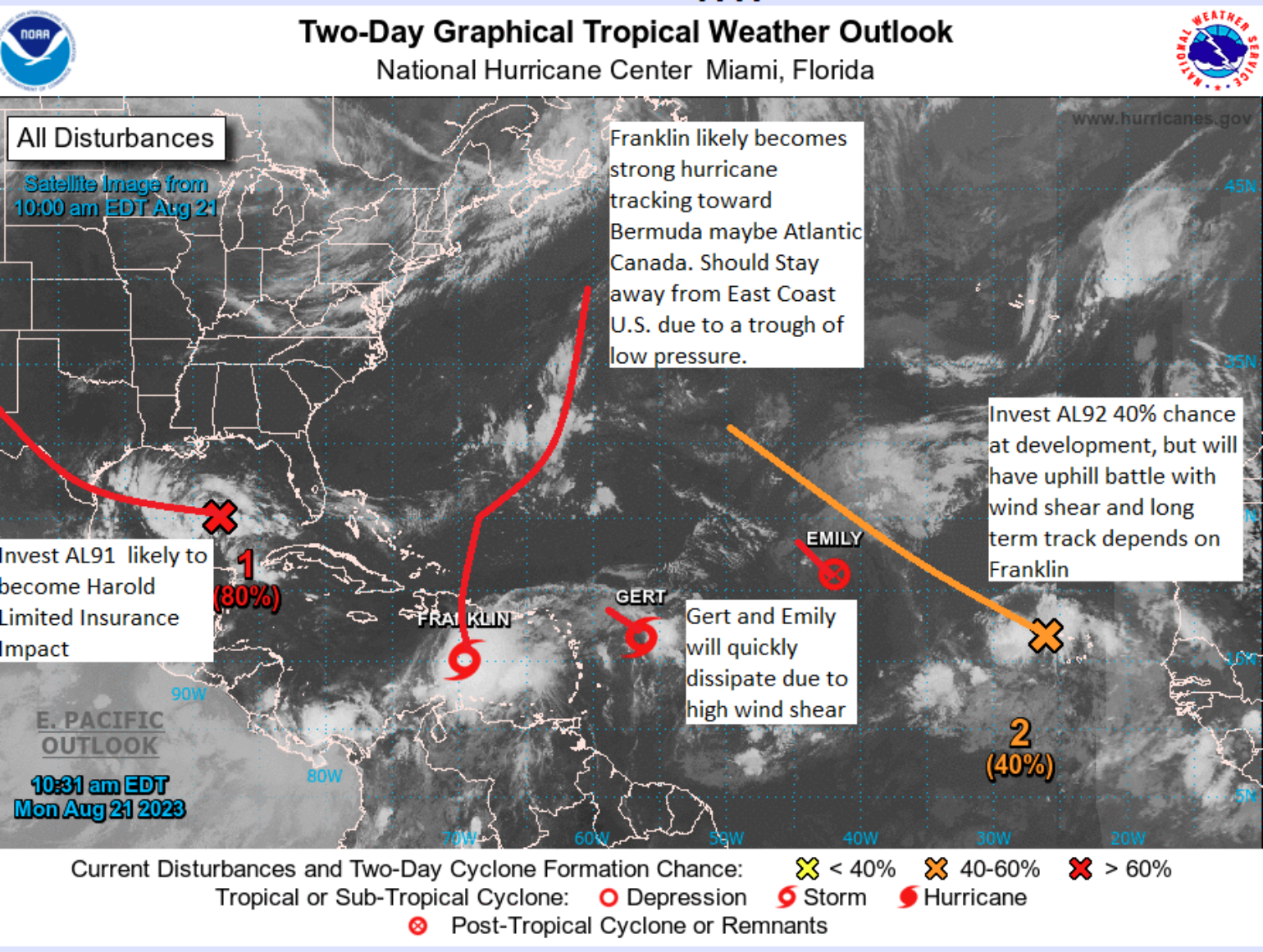 Though, do not forget about the other areas of concern with tropical storms Gert and Emily and invest 92 in the eastern tropical Atlantic. After the next few days, wind shear should increase substantially and be the demise of Gert and Emily, with Emily holding on longer as a tropical depression. Invest 92 will likely follow Emily, but a lot will depend on what happens with Franklin later this week and into this weekend. For that reason, this system needs to be watched as it makes its way into the Atlantic as possibly the “I” storm Idalia.