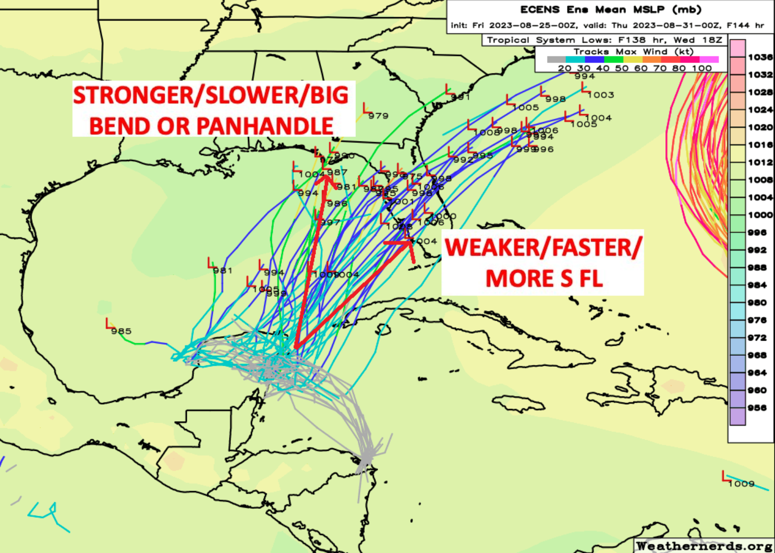 2) A slightly more robust system (due to more erosion of the trough of low pressure drawing this system up from the Caribbean and more time over the warm Gulf) allows it to move up towards the Florida Big Bend area.