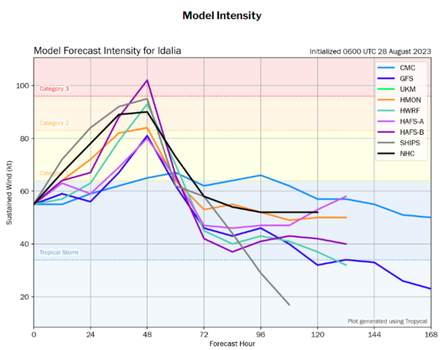 However, hurricane intensity is not all about SST and OHC. You need to have the right upper dynamics. Just like Harold last week, which did not explode into a monster hurricane as it crossed the Gulf of Mexico on its way to Texas. Despite the SST's warm, it did not have ideal upper air conditions for development. Idalia is expected to follow a relatively narrow channel of north–north-eastward steering currents that are between an upper low over the Western Gulf of Mexico, a deep trough that is responsible for much of the heat relief this weekend over the Central Plains, and the subtropical ridge over the Southwest Atlantic. These currents will accelerate Idalia north, then north–northeast late Tuesday and early Wednesday. Exactly how these different airmass interacts with Idalia will be critical in determining how strong Idalia will be at landfall.