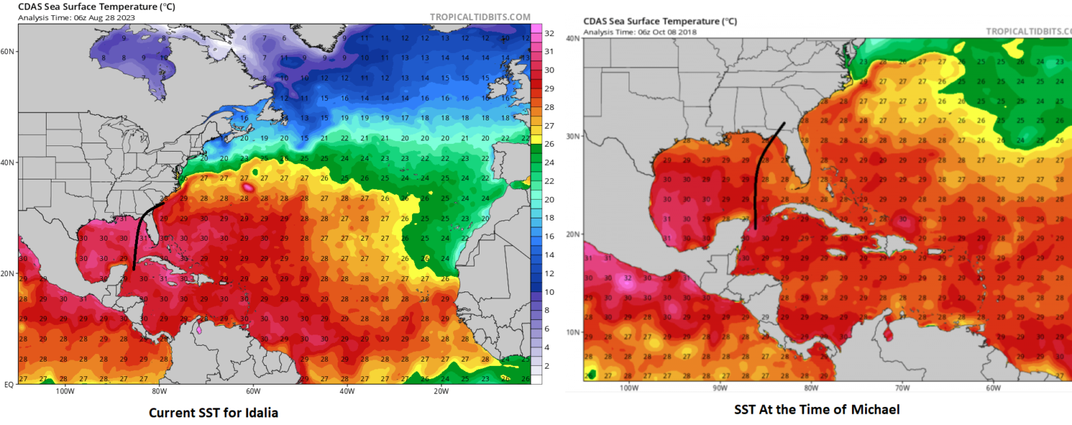 The plot below shows the SST for Idalia is a few degrees warmer than Michael, and although not shown the OHC is warmer as well.