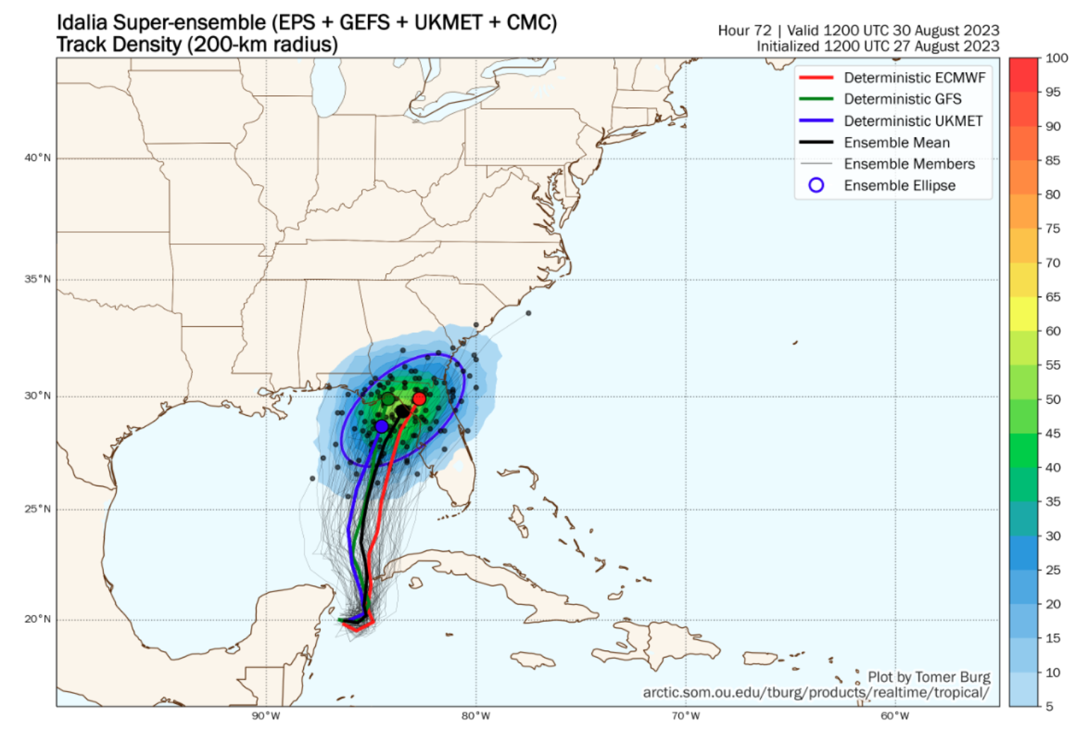 What does this mean? This means plenty of untested homes, businesses, trees, power poles, and people. Most of these residents were not alive the last time an intense hurricane made landfall in this region—however, the good news for the insurance industry is the Big Bend area of Florida is mostly swamp and wildlife management areas until you get down to Crystal River, FL. The general area has a low population density, so the overall industry insurance exposure is lower, which will limit top-end loss. At this point, without suitable analogs, more research needs to be done into catastrophe modelling scenarios to get a better picture of loss. This will be provided tomorrow as the track uncertainty starts to narrow, and the industry can hopefully take some of the larger loss scenarios off the table, which would involve the Tampa Bay Metro area. Until then, the loss range is wide given this possible ensemble scenario of a 30% chance of Tampa Metro area impact. These loss scenarios are pretty eye-opening, which means the next 24 hours are critical to see what the ultimate track for Idalia will be so the industry impacts can be tuned the impacts. Regardless, a major hurricane into any section of Florida that extends into the Southeast states is likely a multi-billion dollar insurance industry event.