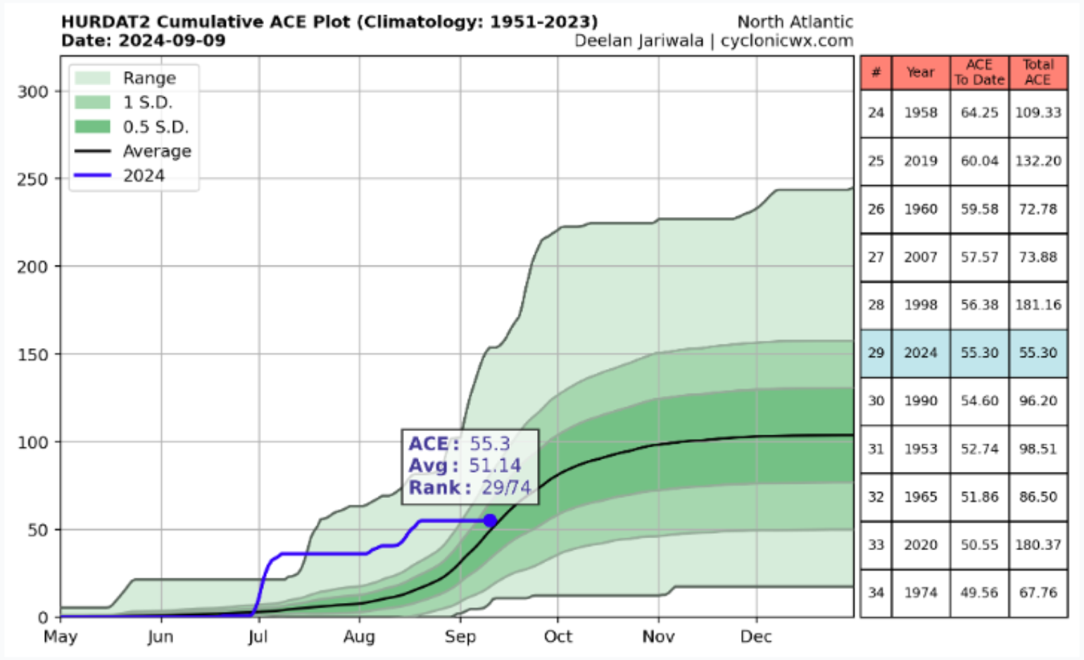 Lastly, the Earth's atmosphere is complex. Sure, warm water helps strengthen storms, and it will certainly be a major factor in the intensification of Francine this week in the Gulf of Mexico. However, storm formation takes much more than just one factor. The colder waters in the Central Pacific are just now starting to reach minor Nina stages; there is also colder water in the equatorial Atlantic basin South of the Main Development Region (MDR), which influenced upper-level wind patterns, possibly resulting in a more northward shift in Africa waves. While this season has only experienced five named storms through the peak of the Atlantic hurricane season, there are still many of the factors that CSU highlights that make it look as if they will start to subsidize based on general climatology. This will likely result in an active second half of the Atlantic Hurricane season. In other words, an above-normal or normal hurricane season is still in the cards. And remember, what the insurance industry cares about is hurricane landfalls. And despite only five named storms, there have been five landfalls from the three hurricanes thus far and 10 landfalls of tropical storms across the Atlantic basin, which is impressive and demonstrates just how impactful this season has been even with a limited number of named storms.