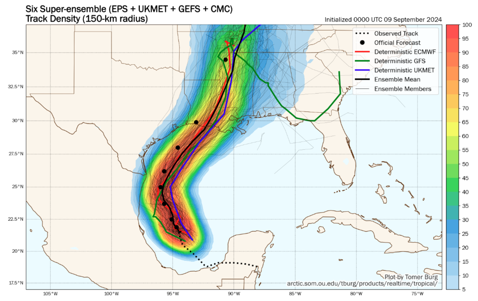 The overall synoptic pattern is complicated, meaning development could be slow over the next day or so. There appear to be two areas of vorticity (Spin) (former 90L) and Invest 91L interacting with one another. Early this morning, the system was about 535 miles south of Cameron, Louisiana, with winds of 50 mph. The system is moving to the north/northwest at 5 mph. In general, one could attempt to just cut and paste the forecast discussion from hurricane Beryl earlier this season as that storm reemerged into the Gulf of Mexico and slowly gained strength as it moved northward. This forecast situation is similar, but Francine will have more time over warm water, allowing it to strengthen even more. The longer the system stays over open water, the stronger it can become and the overall better the environment becomes, which is why the latest ECMWF ensembles shown below show colors of lower pressures in red as a stronger landfalling hurricane.