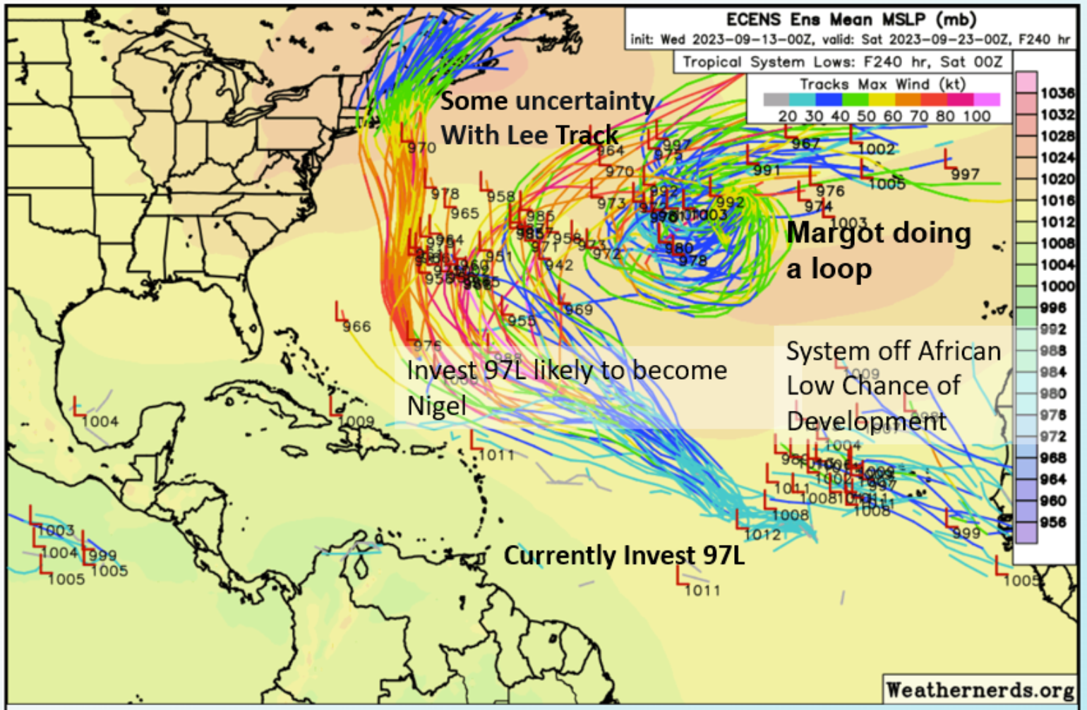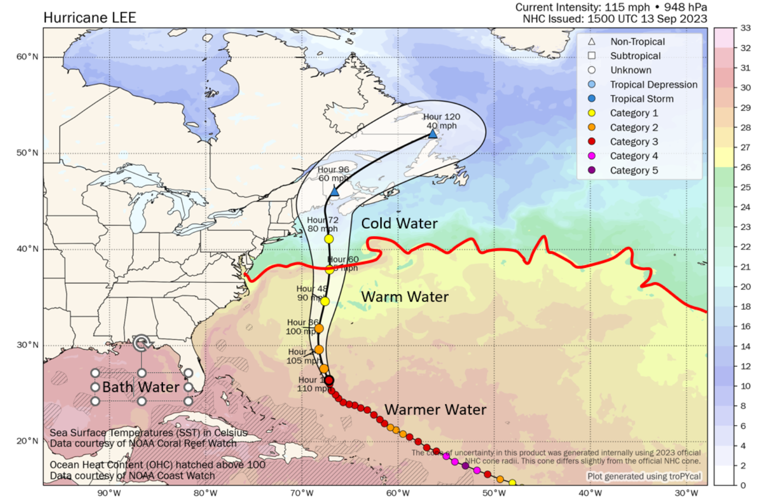 Hurricane Lee is expected to slowly weaken as it starts to pick up speed and move over the cooler water that has been upwelled from the previous hurricanes, Idalia and Franklin, which tracked over the same area. Below is an overlay by Tomer Burg of the National Hurricane Center forecast cone of uncertainty and the current Sea Surface Temperatures (SST). Hurricanes and Named storms like to have water temperatures of at least 26C (80F), and in the plot, one can see that around 40 degrees north latitude, the water temperatures dramatically decrease.