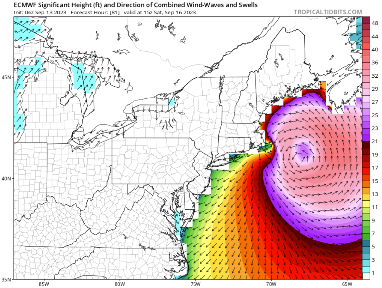 The other aspect of a post-tropical storm that interacts with the jet stream is it can be a prolific rain producer. Water is the number one killer, either storm surge or rainfall flooding. For many insurance policyholders, this might be a power outage/falling tree wind event, but for many more, it could be a widespread flood event, given how wet the region has been this past summer. The other water impact issue will be wind and waves. Given the large size the storm is expected to be as it tracks north, this will generate very large destructive waves and storm surges. The small bays and inlets are suitable for storm surges along Maine and Nova Scotia coastal sections. As a matter of fact, it is common to see some structures suffer damage from coastal Nor’easter out on Cape Cod, which could also be the case with Hurricane Lee.