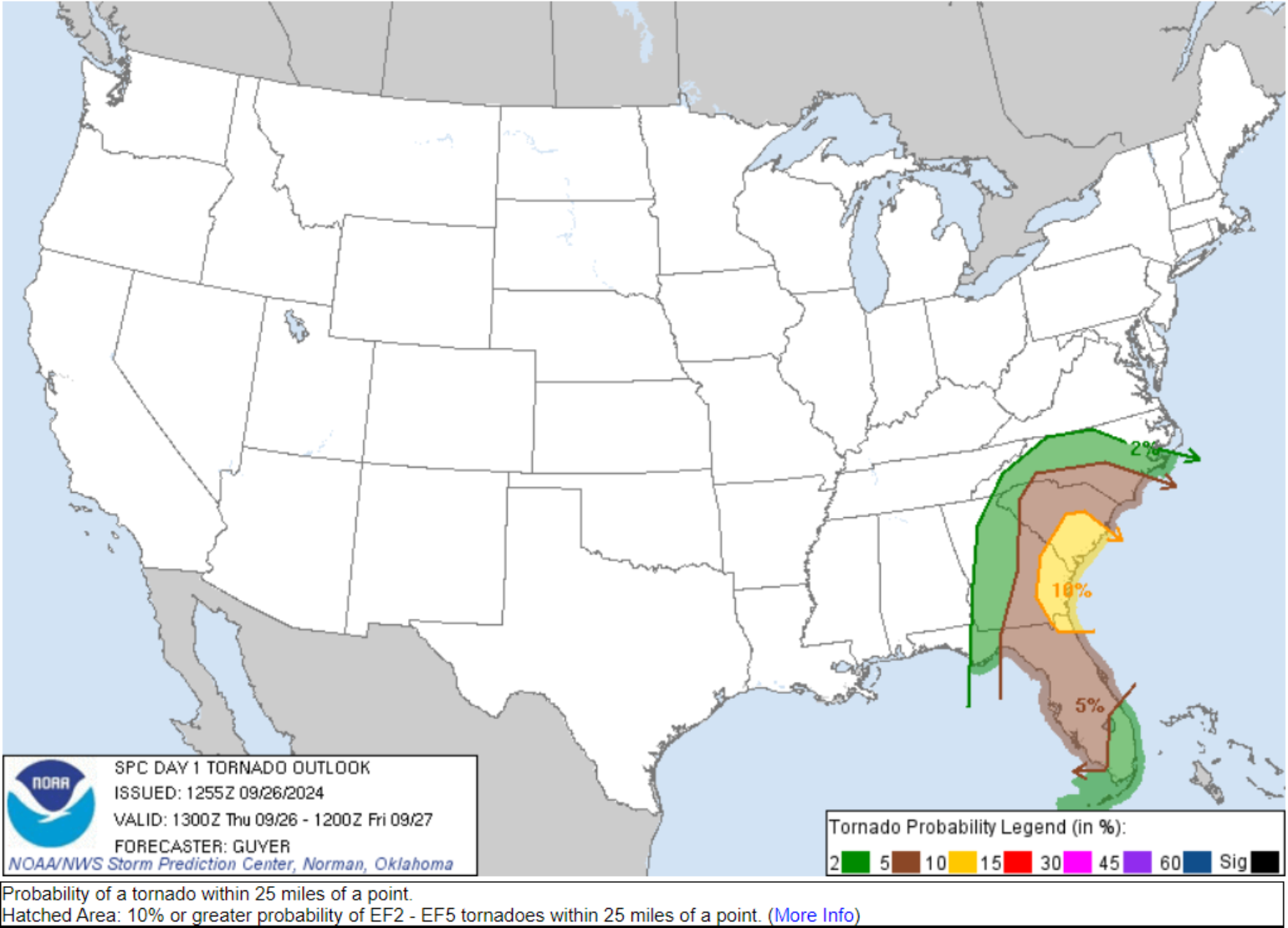 As is common with hurricanes making landfall, and as seen earlier this season with Hurricane Beryl, they can generate short-lived tornadoes. The Storm Prediction Center has the region in an “enhanced” level 3 risk with a 10% chance of a tornado occurring within 25 miles of a point. Remember that tornadoes forming within hurricane wind fields tend to be short-lived and weaker – F0 or F1. They can be dangerous to mobile homes, but reasonably well-built structures will generally see limited damage.