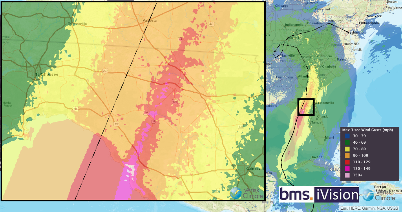 Aside from the strongest winds in Georgia's Big Bend region, much of the wind damage may fall below the higher named storm deductibles, as most structures are built to withstand tropical-storm-force winds. The strongest winds seemed to avoid the Atlanta area, which only had wind gusts of 43 mph. However, Augusta, GA, which is to the east, had a gust of 82 mph. As pointed out, the key to insurance losses might have been how close the strongest winds got to Tallahassee, and it would appear Tallahassee only had a wind gust of 67 mph, and Gainesville had a wind gust of 63 mph. The Perry Airport, located in Florida, experienced a wind gust of 99 mph. As shown in the BMS iVision below, the strongest winds impacted one of the region's lowest housing/population densities, if not the entire U.S. coastline.