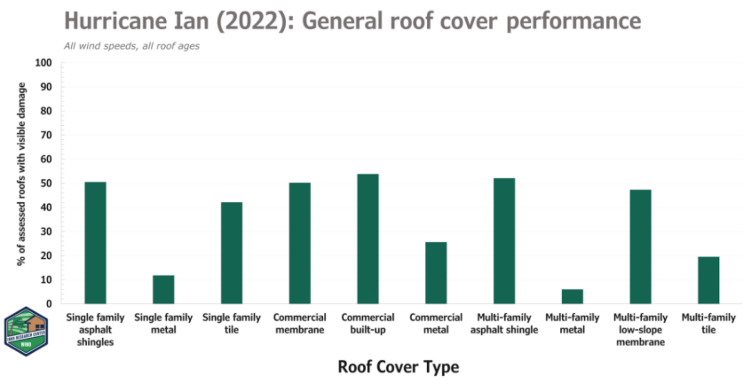 The IBHS found in their study that steep-slope metal roofs performed very well, with a damage rate near 12%, but also showed that damage to metal roofing often resulted from the failure of another building element, such as a carport or a lanai. This highlights that a building is a system, and the entire system needs to be hardened; otherwise, the system fails.
