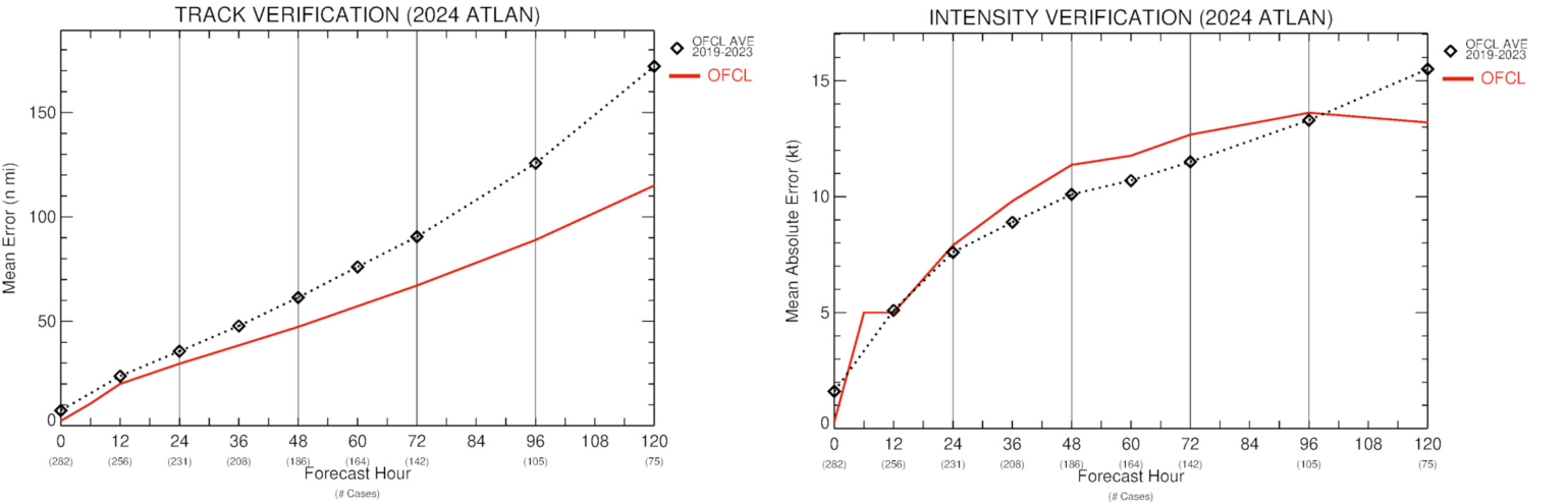 According to data that Brian McNoldy collects, the National Hurricane Center has approved the 2019 – 2023 Average Track error overall this season, particularly in the longer forecast time frames of 96 and 120 hours. The Intensity forecast was a bit more tricky this year, but overall, they aligned with the average intensity error and improved upon the intensity forecast at 120 hours.