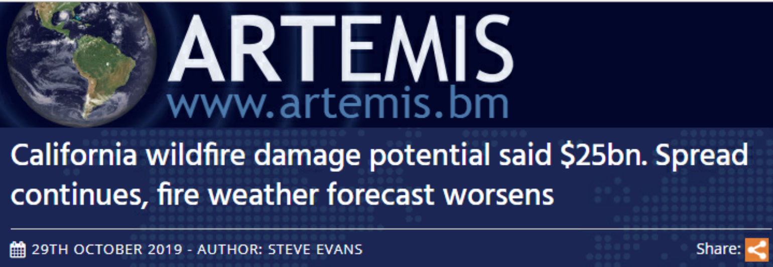 In fact, of the current wildfires reported by CAL FIRE, only 242 structures have been destroyed, as compared to the thousands that occurred in 2017 and 2018. I guarantee that this number will climb as the assessment continues. A large fire that wipes out thousands of homes could, of course, still occur this season. But, in my opinion, the industry needs to take a deep breath and trust that the last week has been a buildup to something less extreme at the start of November. Unfortunately, the true end to the fire season is a long time from now, and I don’t see any rain in the forecast for at least the next 10 days. Lastly, we can’t underestimate the amazing work that firefighting crews are doing to try and contain these fires before any more serious damage occurs. For example, the Misty Fire near Oroville, CA was quickly attended to yesterday with air and ground support minutes after it started. These efforts limit insured loss.