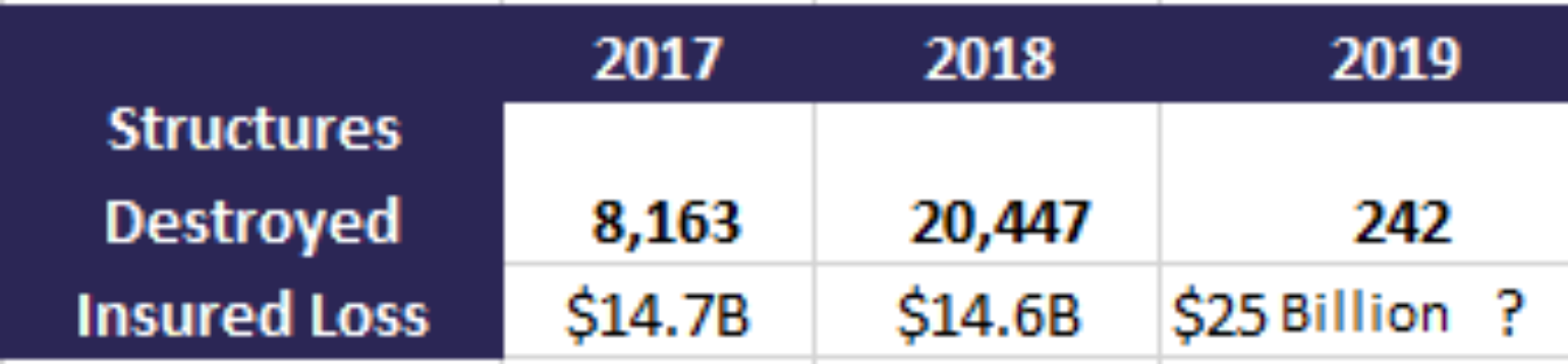 However, I want to first say that, so far, the fires of the last month have caused nowhere near the level of destruction to the industry that was experienced in 2017 and 2018. Headlines like the one below are simply causing unnecessary panic. There is a huge difference between the number of structures exposed versus structures that burn.