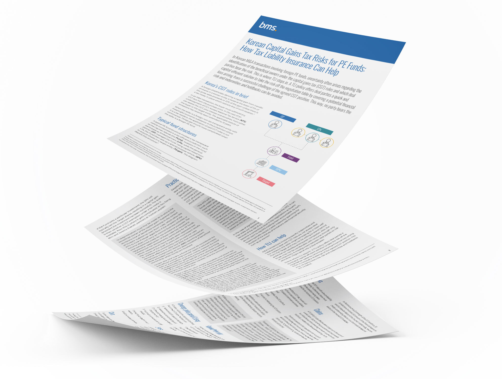 In Korean M&A transactions involving foreign PE funds, uncertainty often arises regarding the identification of the beneficial owners under the capital gains tax (CGT) rules and which deal parties bear the risk. This is where TLI steps in. A TLI policy offers deal parties a quick and capital-efficient solution to take the risk off the negotiation table by covering a potential financial loss arising from a successful challenge of the agreed CGT position. This way, no party bears the risk and indemnities and holdbacks can be avoided.