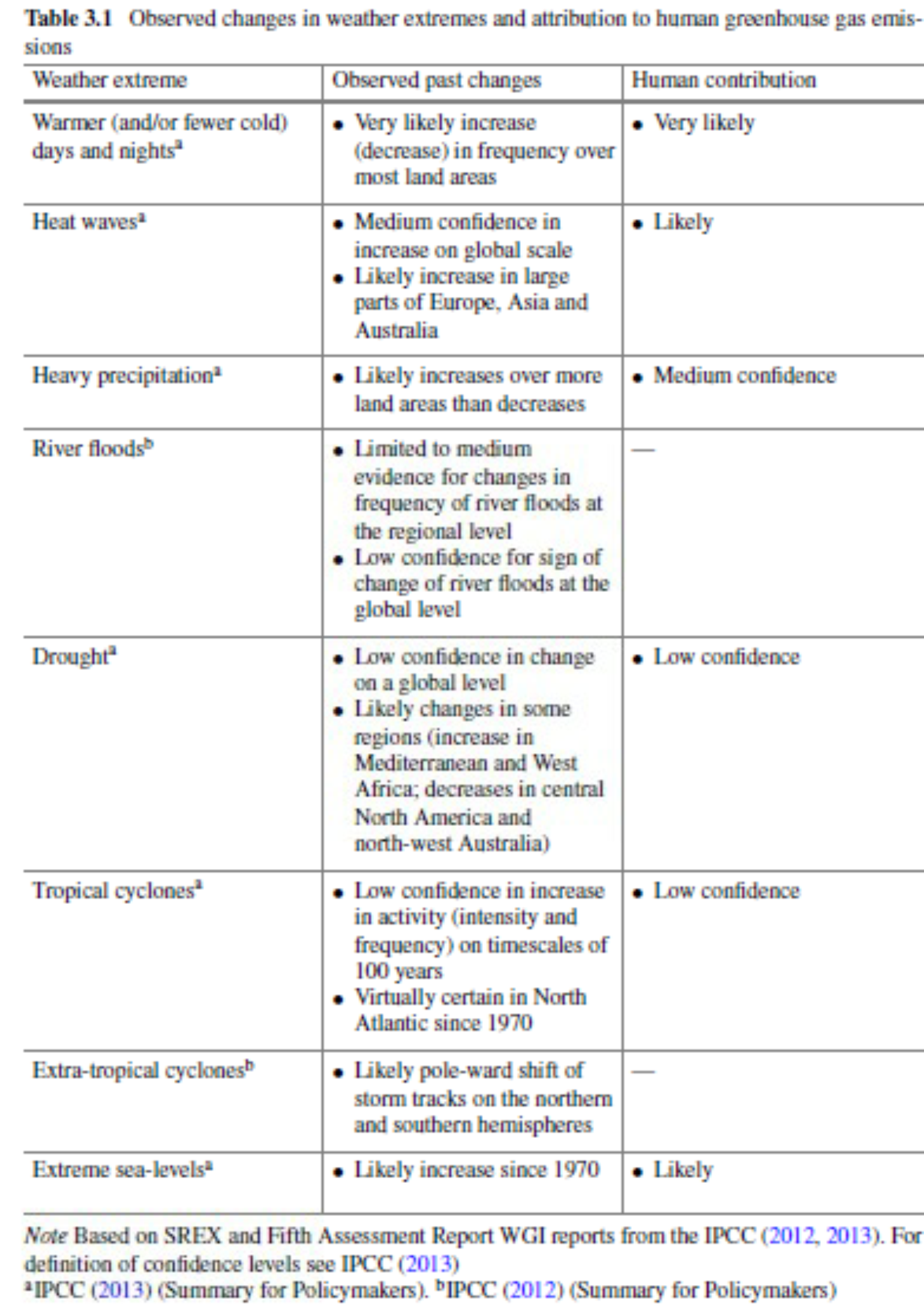 In Chapter 3, Lauren Bouwer from the Climate Service Center Germany (GERICS), Hamburg, takes a look at the current understanding of how observed and projected extreme weather events impact loss and damage. Much of the publication references past work by the Intergovernmental Panel Climate Change (IPCC), as they are still the most trusted body in the aggregation of the latest research in this area. Within the publication, two tables best sum up the current knowledge around observed changes in weather extremes, damage/losses, and attribution that will occur in a warmer world caused by humans, shown in Tables 3.1 and 3.2 below.