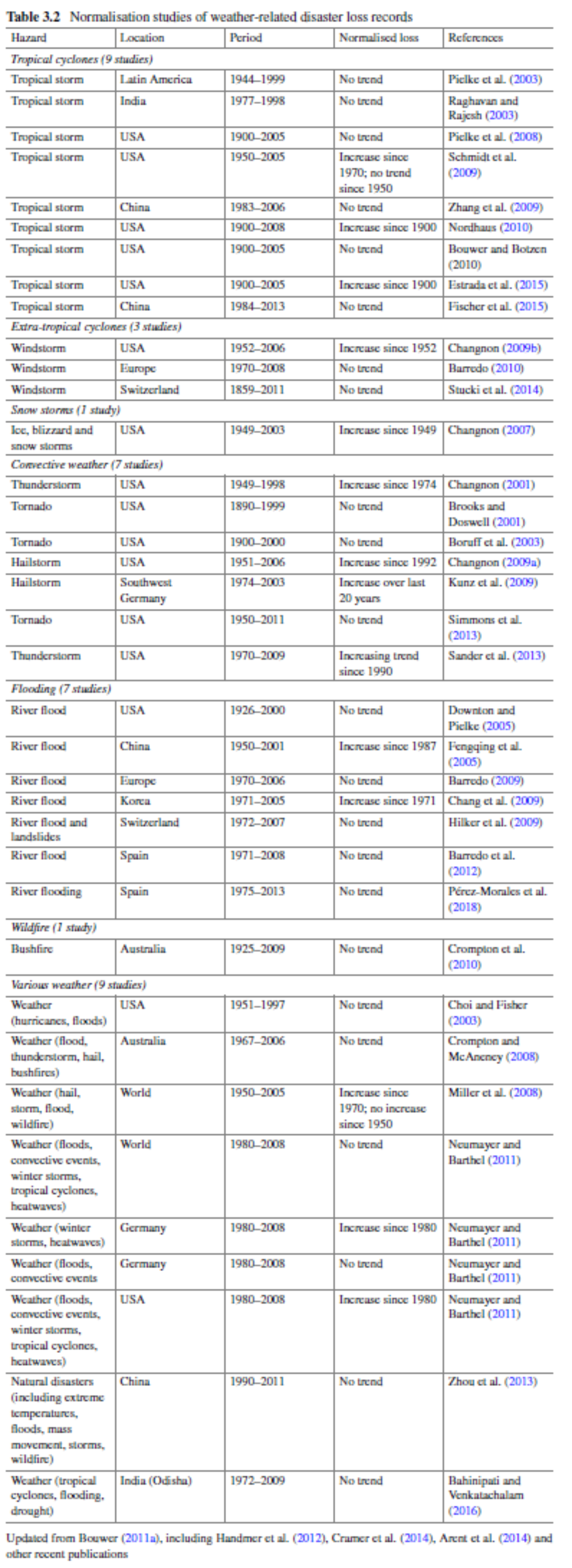 Table 3.2 provides a comprehensive overview of scientific studies on types of extreme weather and the trends of normalized losses associated with them. As the IPCC has stated in the past, there could be some detected trends at regional or national levels, but the overall conclusion is that very few studies show upward trends in loss after normalizing for changes in socioeconomic factors.