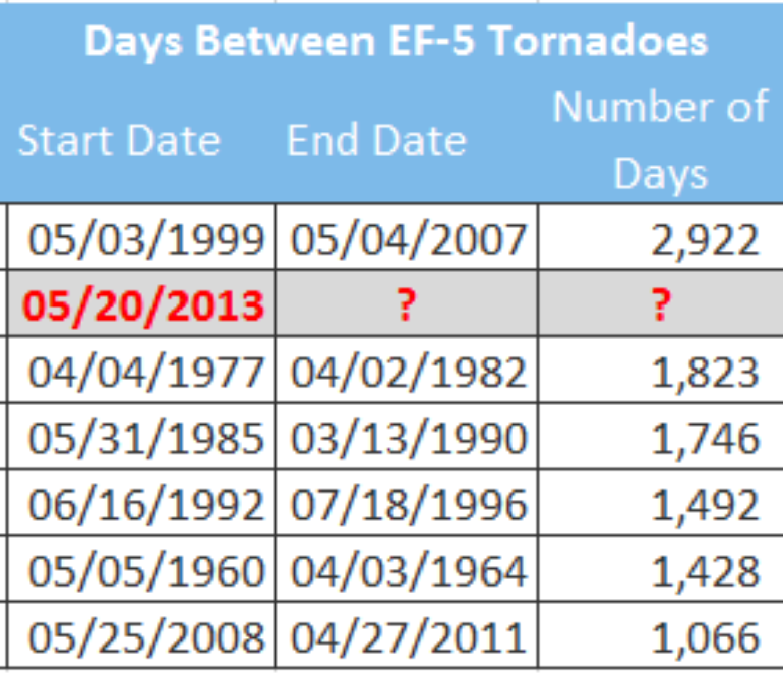 With that being said the U.S. is quietly in a remarkable EF5 tornado drought. The last EF5 tornado to be observed in the U.S. was a devastating violent tornado that impacted the towns of Newcastle and Moore, Oklahoma at just after 2 pm on May 20th, 2013. The tornado claimed 24 lives, had inflation insurance adjusted loss of at least $1.3B, and much higher economic losses.