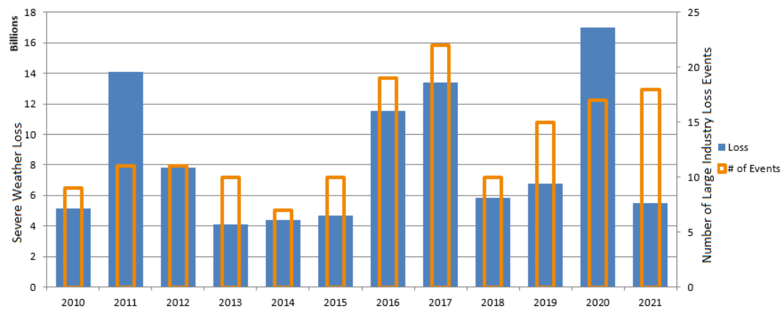 Regardless this lack of activity is good news for the insurance industry that has a hard time quantifying the impacts of tornado events, which are considered a tail event when they do occur. On average, hail and other thunderstorm wind impacts are the biggest driver of insurance loss with hail being on average about 60% of the average annual loss in any given year. Thus far this year the insurance industry has experienced 18 severe weather events of $25 million or more. That equates to a preliminary total loss of just over $5B with some loss development yet to occur. When compared to last year, which had 17 severe weather events year-to-date, it is clear that the severity of those events was much higher. 2021 so far is more in line with years like 2018 and 2019.